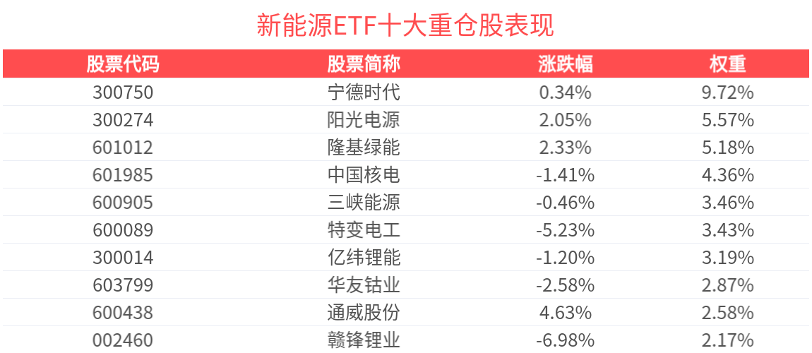 数据显示,截至2025年9月30日,中证新能源指数前十大权重股分别为宁德时代、阳光电源、亿纬锂能、隆基绿能、华友钴业、特变电工、中国核电、赣锋锂业、先导智能、三峡能源,前十大权重股合计占比45.2%。